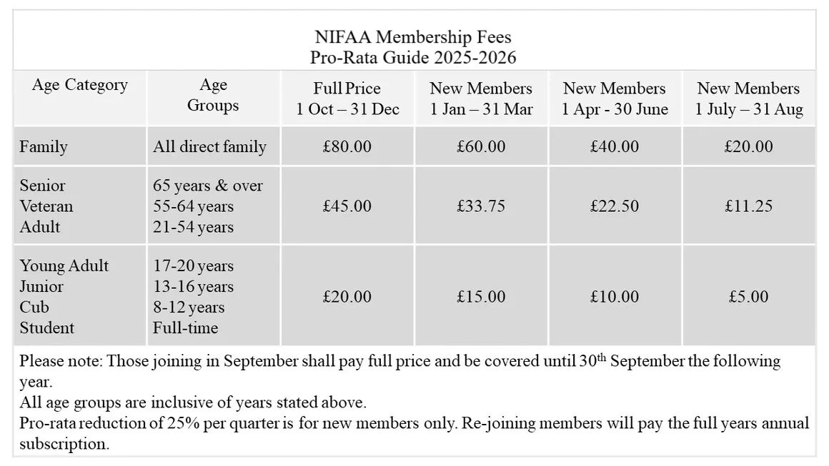Renewals - Due by 1st October annually. The NIFAA membership year runs from 1st Oct to 30th September each year.